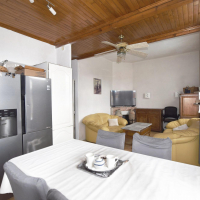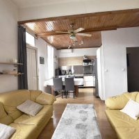 À l’étage, on découvre une cuisine fonctionnelle ouverte sur le salon, deux chambres confortables avec placards et une salle d’eau avec WC.
